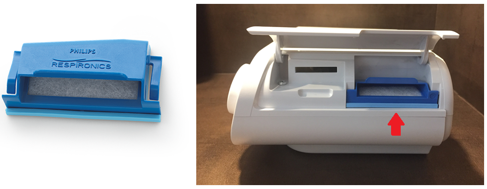 2.  วางแผ่นกรองละเอียด (สีขาว) เข้าไปในตัวเครื่อง โดยหันด้านสีขาวเข้าข้างใน และ หันด้านที่มีตัวหนังสือ (คำว่า PHILIPS RESPIRONICS) ออกข้างนอก