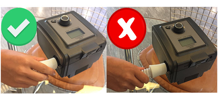 2. ท่อบิด หากมีการบิดของตัวท่อ จะทำให้การไหลของแรงดันไม่ดี ผู้ใช้จะรู้สึกว่าแรงลมรักษาเบา และใช้เครื่องได้ไม่ดีเท่าที่ควร